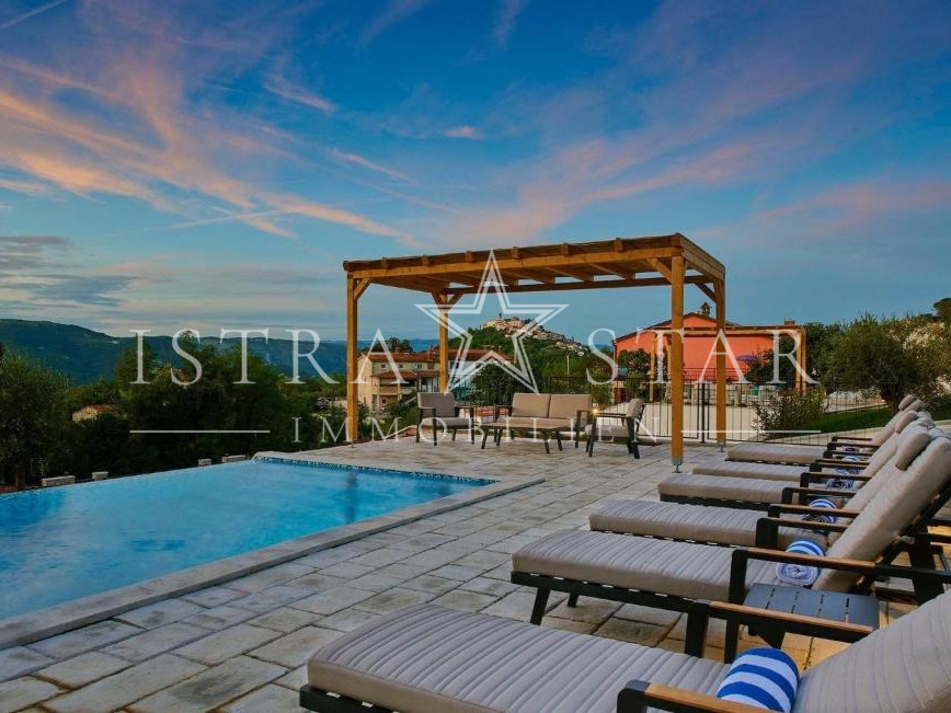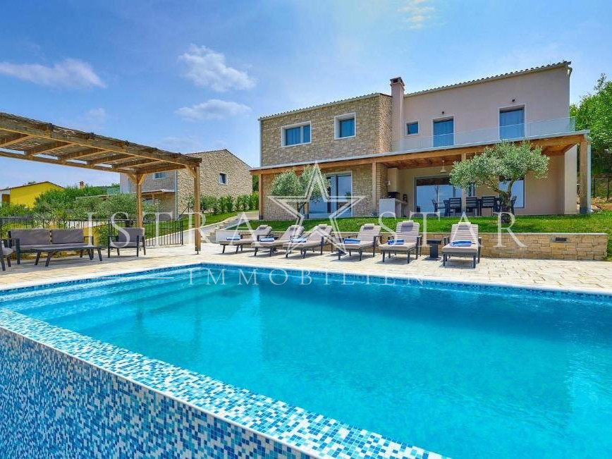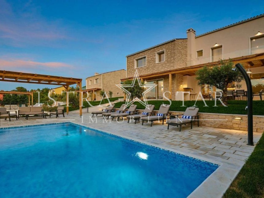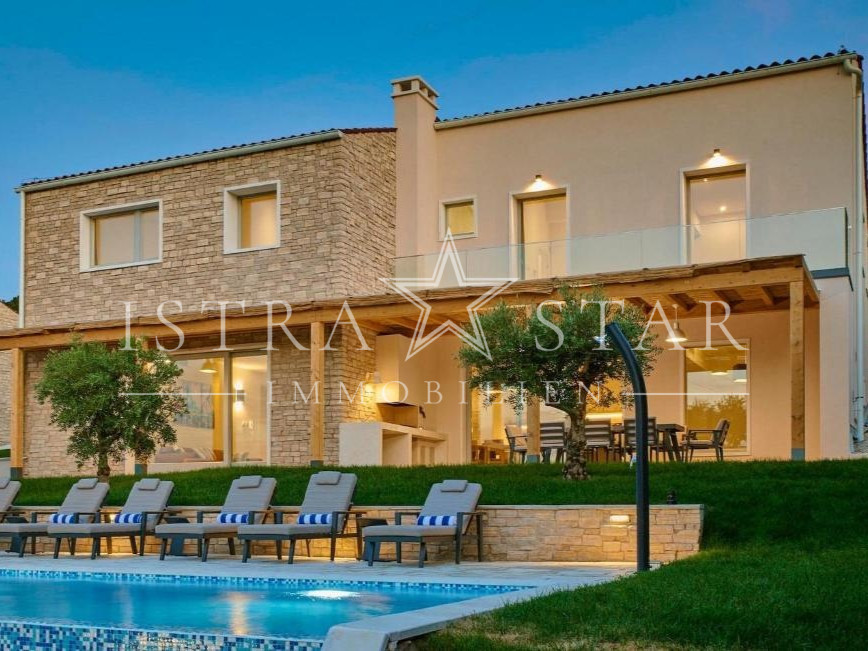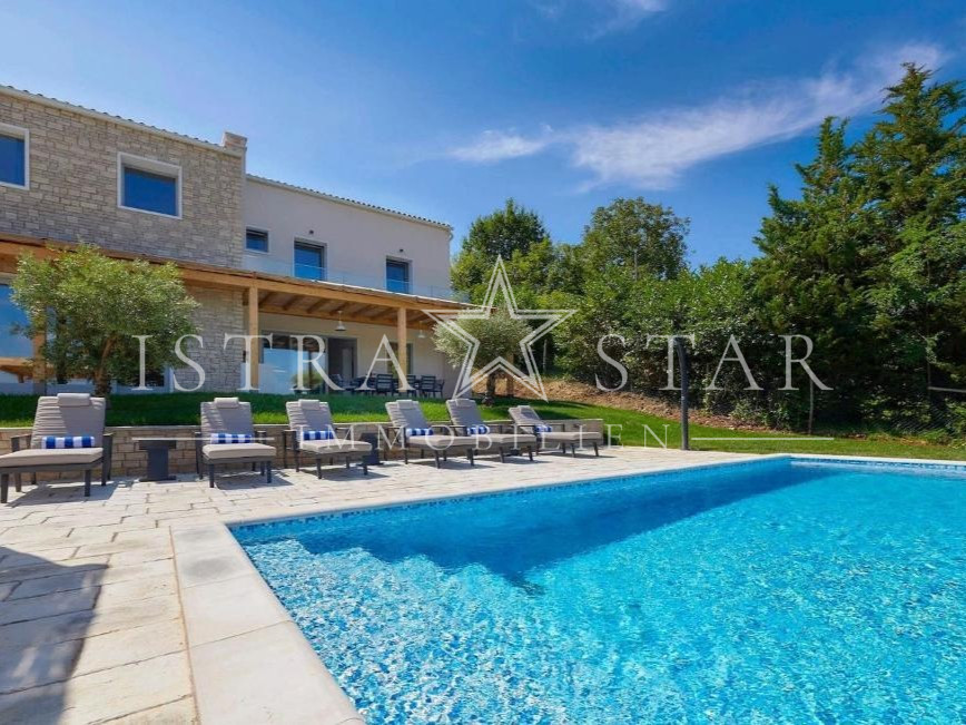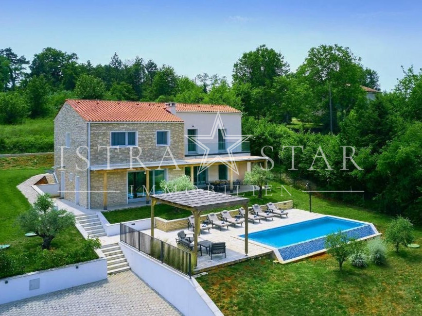 In ruhiger, erhöhter Lage mit freiem Blick über das Tal des Flusses Mirna bis hin zum mittelalterlichen Motovun befindet sich diese freistehende Villa auf einem großzügigen Grundstück von ca. 1.300 m². Das im Jahr 2019 erbaute Anwesen vereint moderne Architektur, hochwertige Technik und mediterranes Lebensgefühl in einer der begehrtesten Naturlagen Istriens.