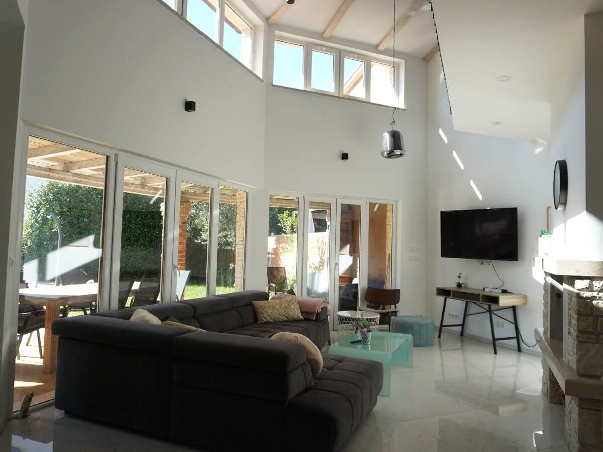 Das offene Wohnkonzept bildet das Herzstück des Hauses: Große Fenster durchfluten den Raum mit natürlichem Licht und schaffen eine helle, freundliche Atmosphäre. Die offene Bauweise ermöglicht einen fließenden Übergang zwischen den Bereichen.