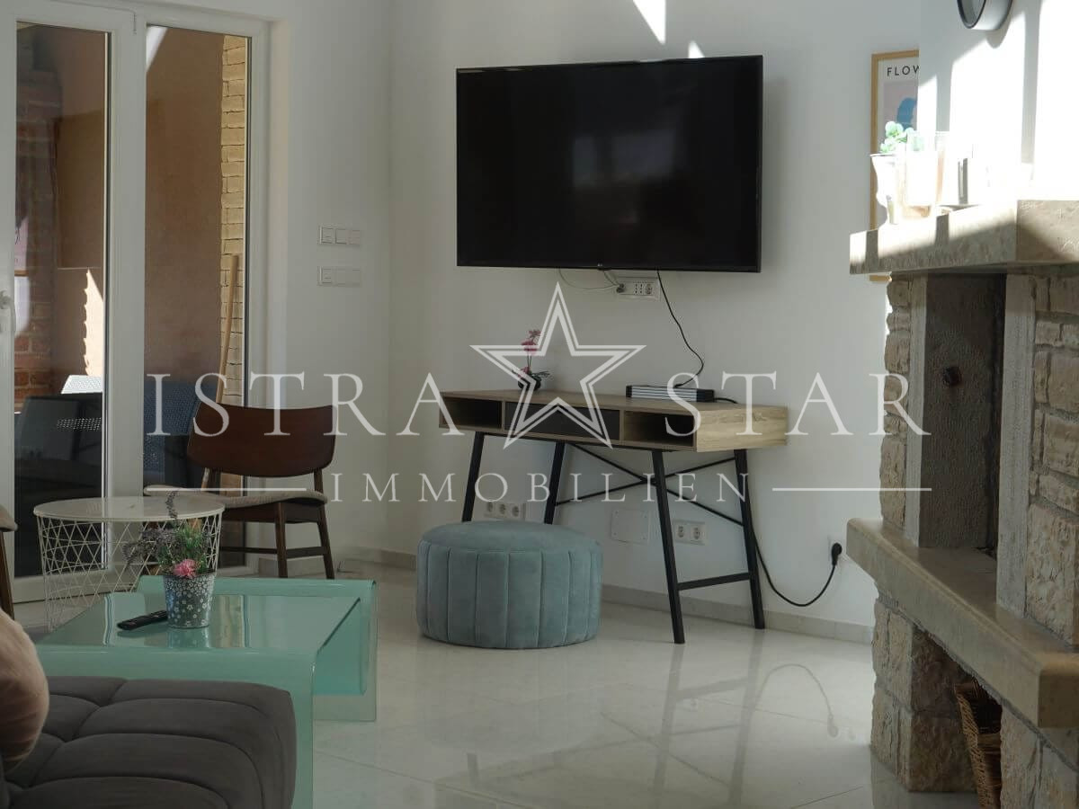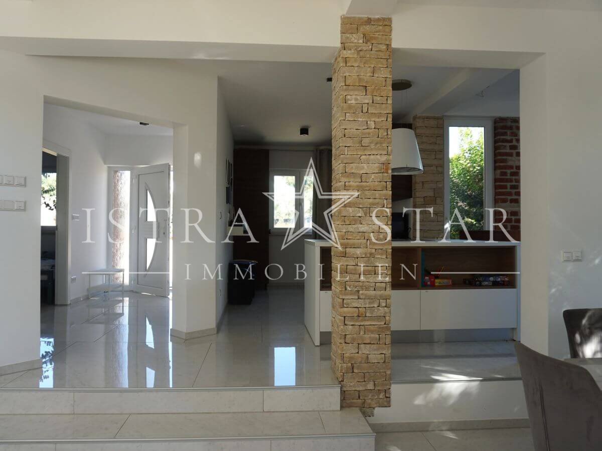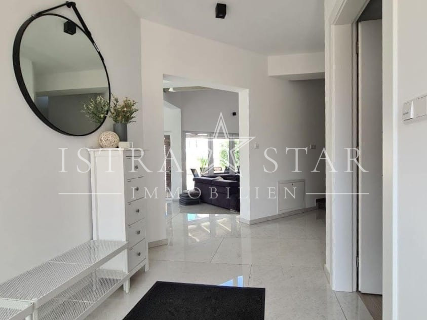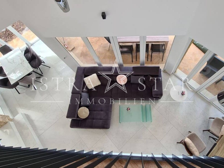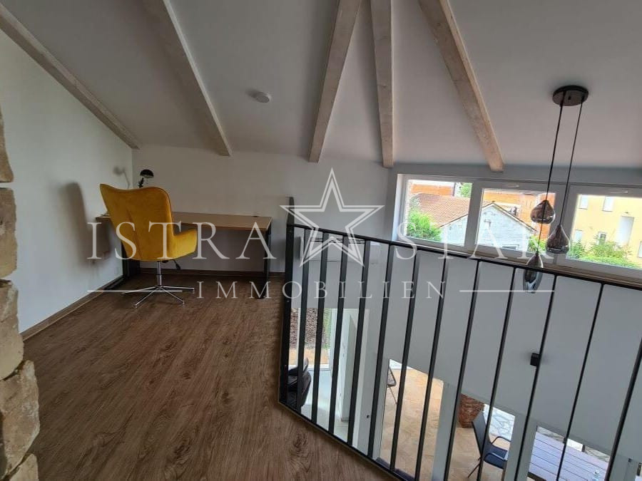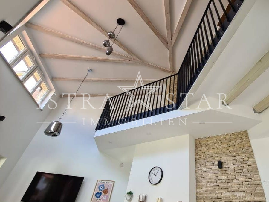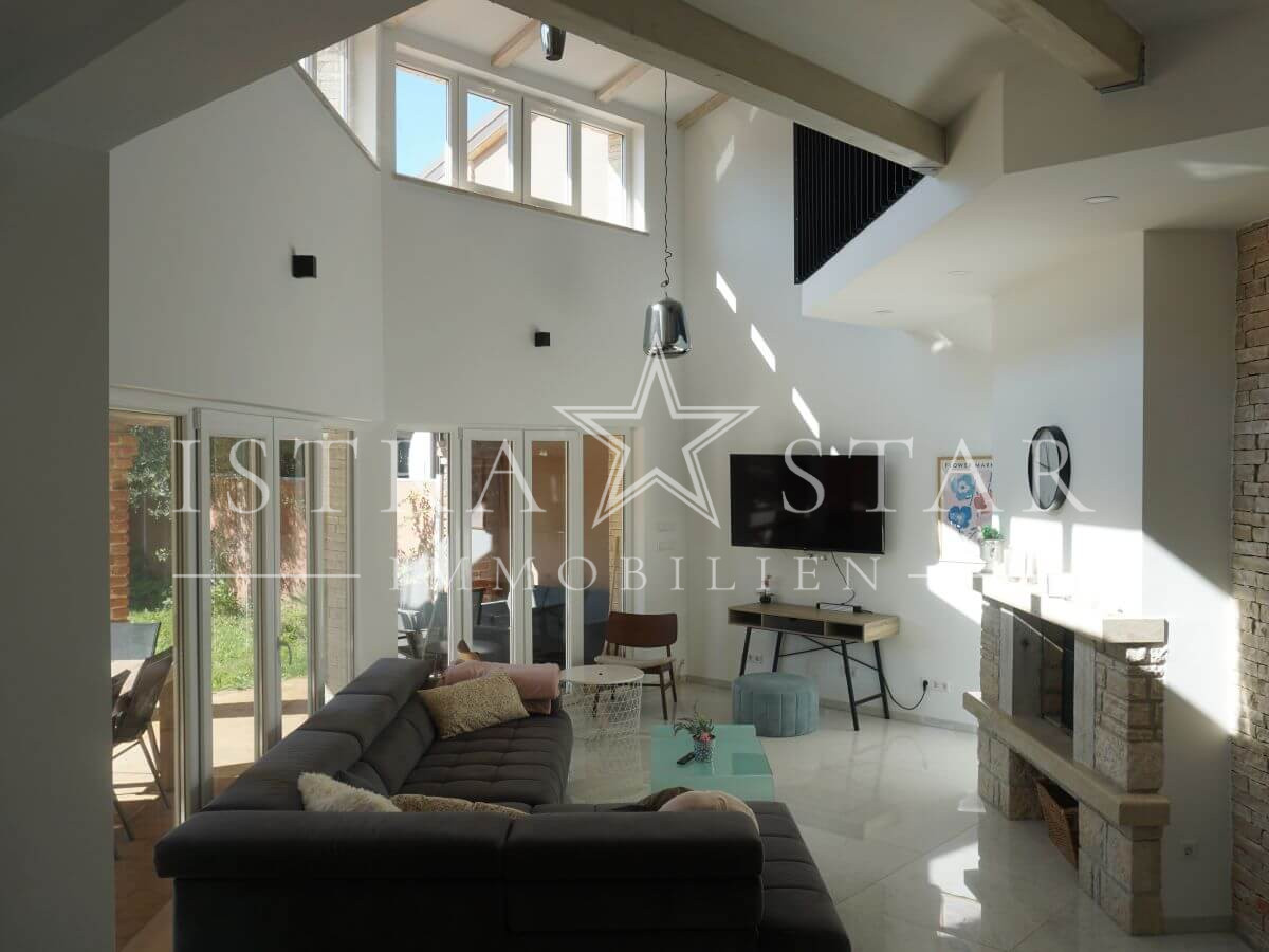 Besonders beeindruckt die Galerie mit ihrer hohen Decke, die teilweise mit stilvollen Holzbalken versehen ist und dem Raum luftige Eleganz verleiht. Über zwei Stufen gelangt man ins gemütliche Wohnzimmer, das durch eine dekorative Natursteinsäule und Natursteinwände Charakter verleiht und istrischen Charme mit moderner Einrichtung harmonisch verbindet. Ein offener Kamin aus Naturstein sorgt an kühleren Tagen für behagliche Wärme. Vom Wohnbereich aus gelangen Sie zur überdachten Terrasse, die sich ideal für entspannte Stunden im Freien eignet. Die offene Küche gilt als weiterer Höhepunkt des Erdgeschosses: Sie ist mit einer Kochinsel und einer integrierten Bar ausgestattet und lädt zu geselligem Kochen und Verweilen ein. Der angrenzende Essbereich bietet einen malerischen Blick auf den seitlichen Garten sowie auf einen majestätischen Olivenbaum, der dem Außenbereich mediterrane Note verleiht.