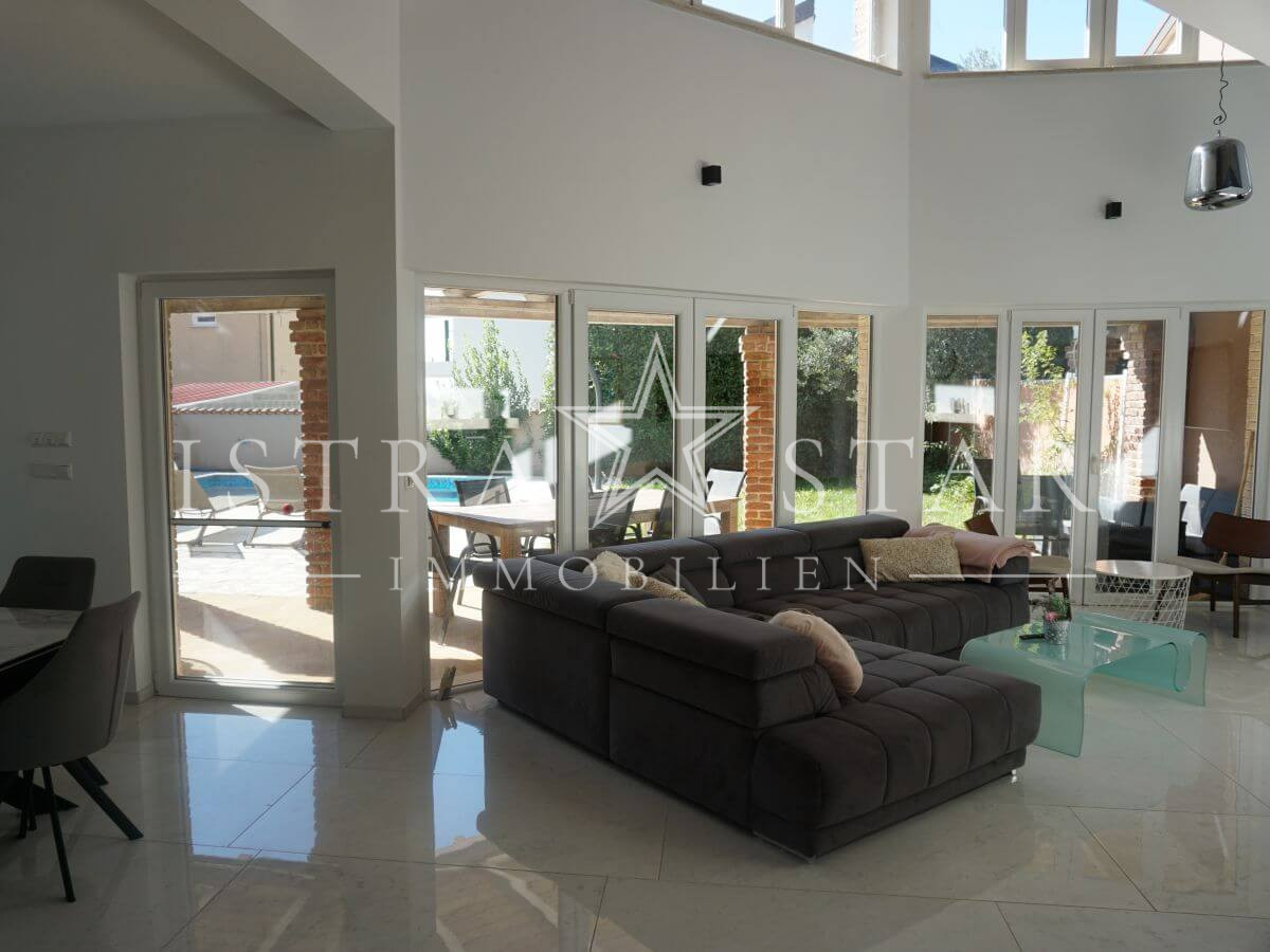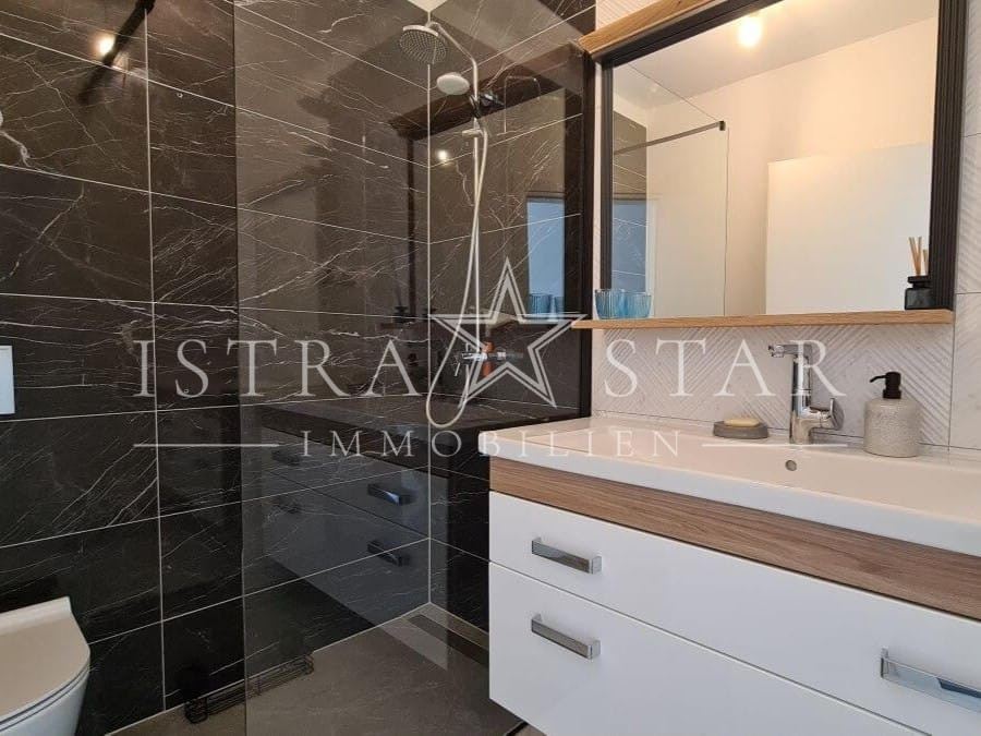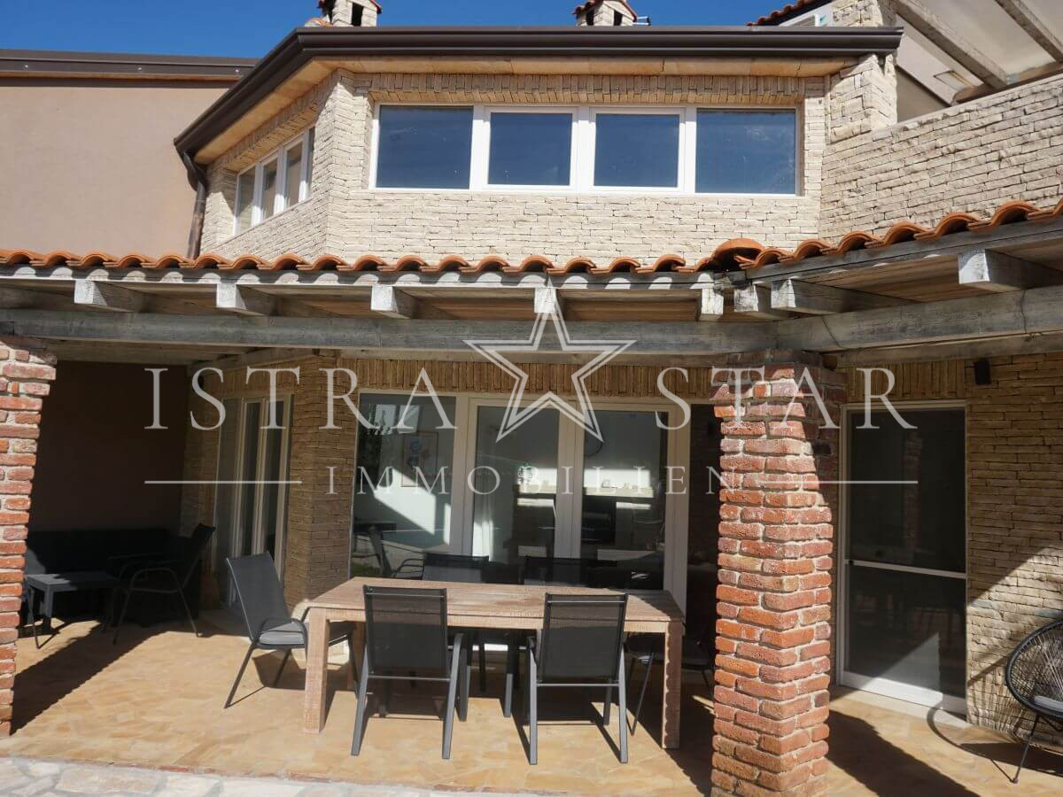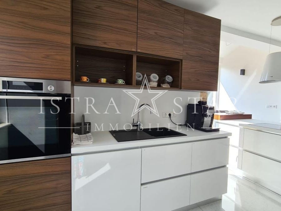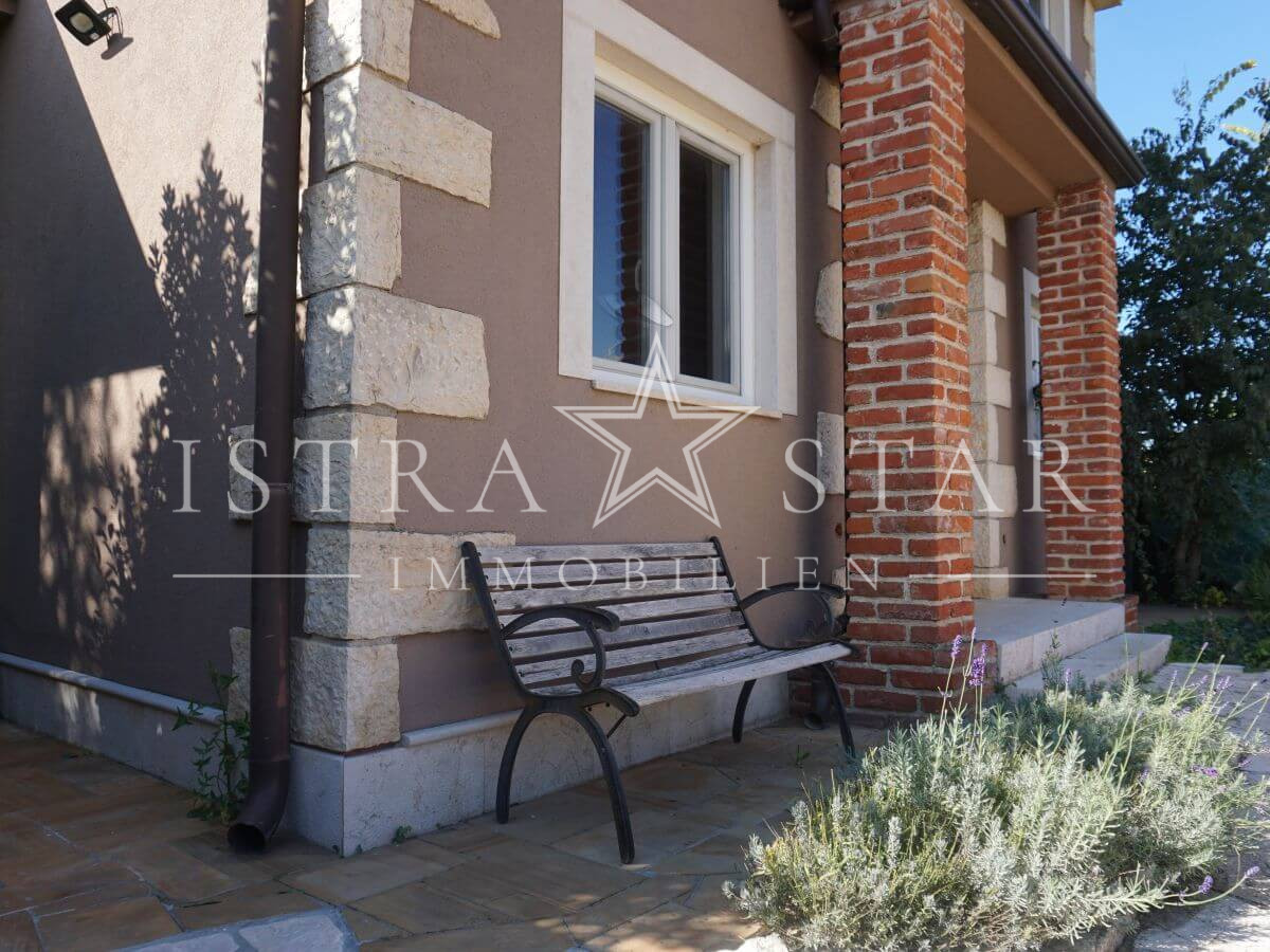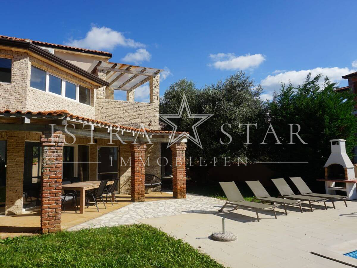 Besonders beeindruckt die Galerie mit ihrer hohen Decke, die teilweise mit stilvollen Holzbalken versehen ist und dem Raum luftige Eleganz verleiht. Über zwei Stufen gelangt man ins gemütliche Wohnzimmer, das durch eine dekorative Natursteinsäule und Natursteinwände Charakter verleiht und istrischen Charme mit moderner Einrichtung harmonisch verbindet. Ein offener Kamin aus Naturstein sorgt an kühleren Tagen für behagliche Wärme. Vom Wohnbereich aus gelangen Sie zur überdachten Terrasse, die sich ideal für entspannte Stunden im Freien eignet. Die offene Küche gilt als weiterer Höhepunkt des Erdgeschosses: Sie ist mit einer Kochinsel und einer integrierten Bar ausgestattet und lädt zu geselligem Kochen und Verweilen ein. Der angrenzende Essbereich bietet einen malerischen Blick auf den seitlichen Garten sowie auf einen majestätischen Olivenbaum, der dem Außenbereich mediterrane Note verleiht.