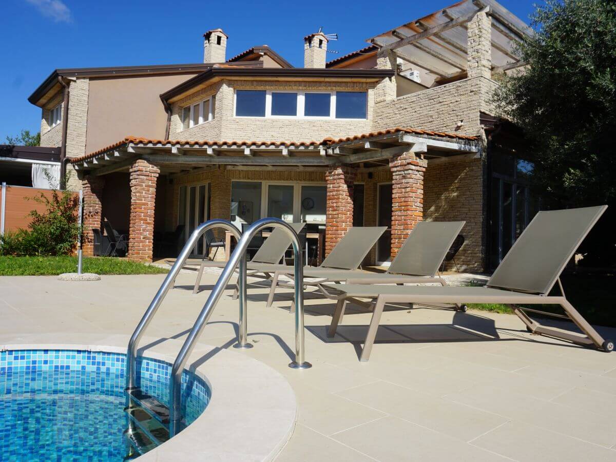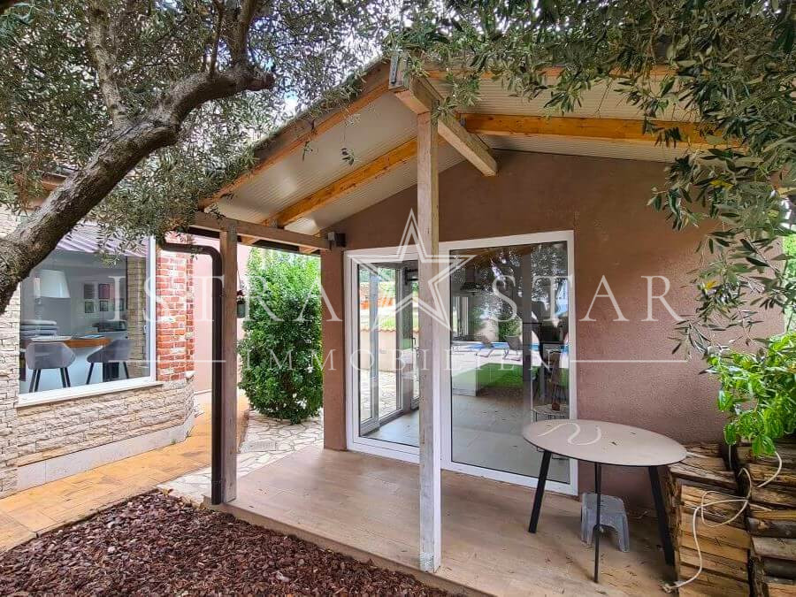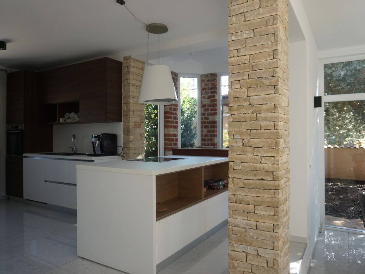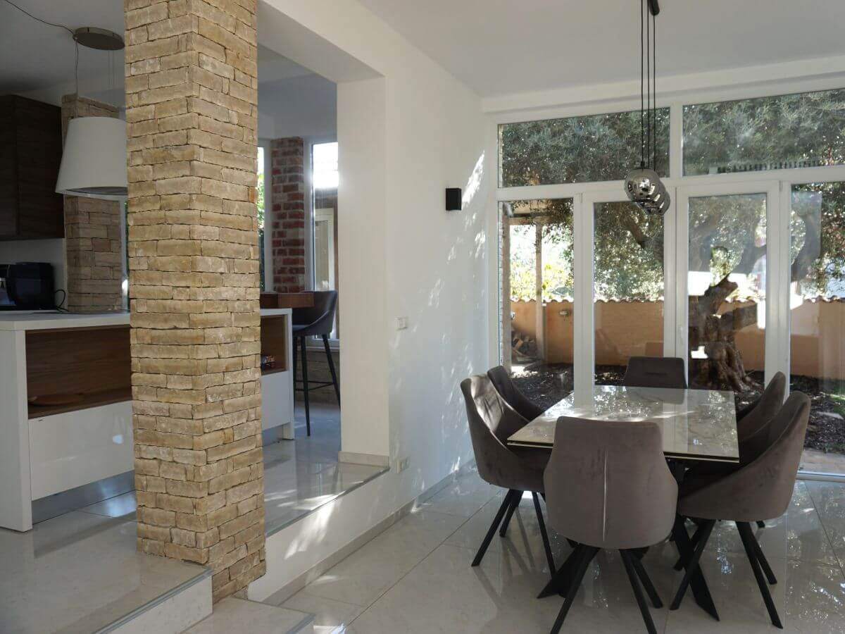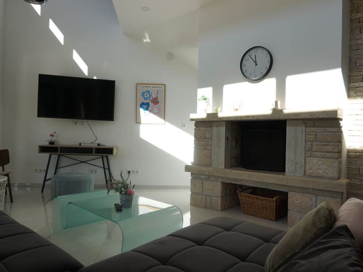Besonders beeindruckt die Galerie mit ihrer hohen Decke, die teilweise mit stilvollen Holzbalken versehen ist und dem Raum luftige Eleganz verleiht. Über zwei Stufen gelangt man ins gemütliche Wohnzimmer, das durch eine dekorative Natursteinsäule und Natursteinwände Charakter verleiht und istrischen Charme mit moderner Einrichtung harmonisch verbindet. Ein offener Kamin aus Naturstein sorgt an kühleren Tagen für behagliche Wärme. Vom Wohnbereich aus gelangen Sie zur überdachten Terrasse, die sich ideal für entspannte Stunden im Freien eignet. Die offene Küche gilt als weiterer Höhepunkt des Erdgeschosses: Sie ist mit einer Kochinsel und einer integrierten Bar ausgestattet und lädt zu geselligem Kochen und Verweilen ein. Der angrenzende Essbereich bietet einen malerischen Blick auf den seitlichen Garten sowie auf einen majestätischen Olivenbaum, der dem Außenbereich mediterrane Note verleiht.