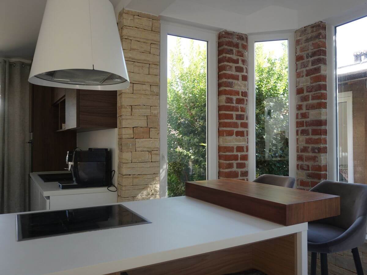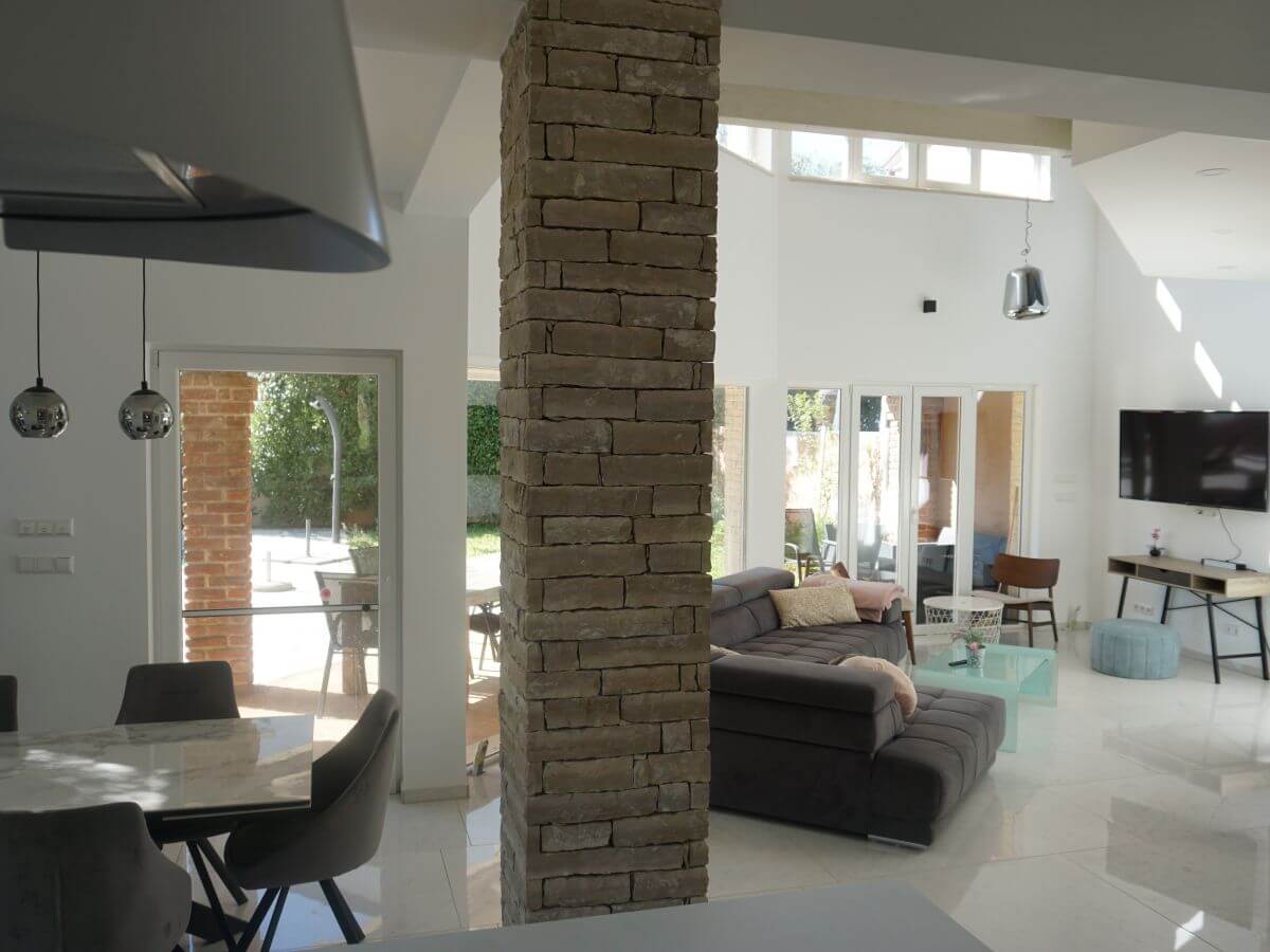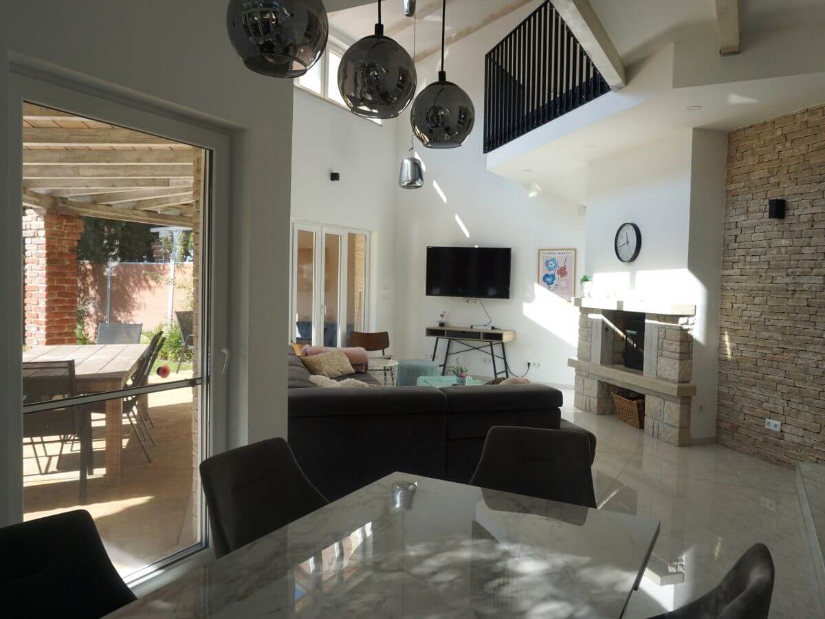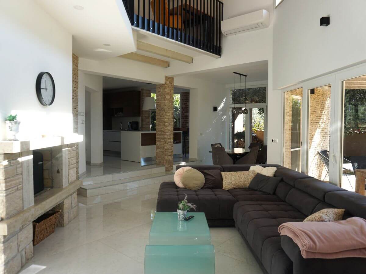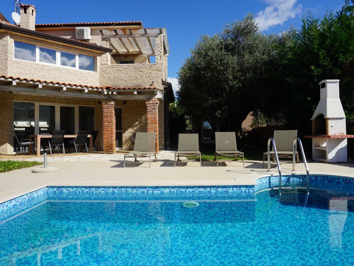 Besonders beeindruckt die Galerie mit ihrer hohen Decke, die teilweise mit stilvollen Holzbalken versehen ist und dem Raum luftige Eleganz verleiht. Über zwei Stufen gelangt man ins gemütliche Wohnzimmer, das durch eine dekorative Natursteinsäule und Natursteinwände Charakter verleiht und istrischen Charme mit moderner Einrichtung harmonisch verbindet. Ein offener Kamin aus Naturstein sorgt an kühleren Tagen für behagliche Wärme. Vom Wohnbereich aus gelangen Sie zur überdachten Terrasse, die sich ideal für entspannte Stunden im Freien eignet. Die offene Küche gilt als weiterer Höhepunkt des Erdgeschosses: Sie ist mit einer Kochinsel und einer integrierten Bar ausgestattet und lädt zu geselligem Kochen und Verweilen ein. Der angrenzende Essbereich bietet einen malerischen Blick auf den seitlichen Garten sowie auf einen majestätischen Olivenbaum, der dem Außenbereich mediterrane Note verleiht.