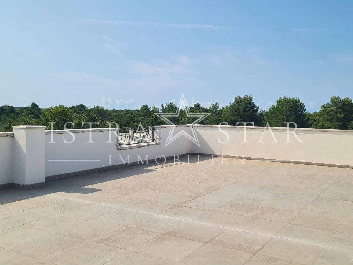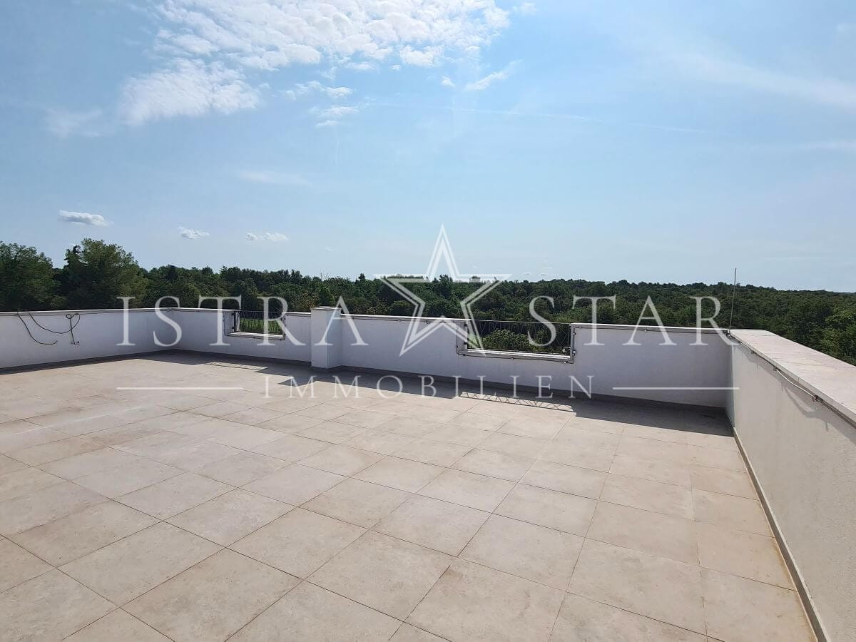 Der Flur führt direkt in den offenen großzügigen Wohn- und Essbereich, der durch seine Helligkeit und moderne Gestaltung überzeugt. Die offene Küche ist etwas abgetrennt. Über das Treppenhaus erreicht man die 86 m² große Dachterrasse, die einen beeindruckenden Blick auf die umliegende Landschaft und das grüne Umfeld gewährt. Hier können Sie entspannte Stunden im Freien verbringen.
