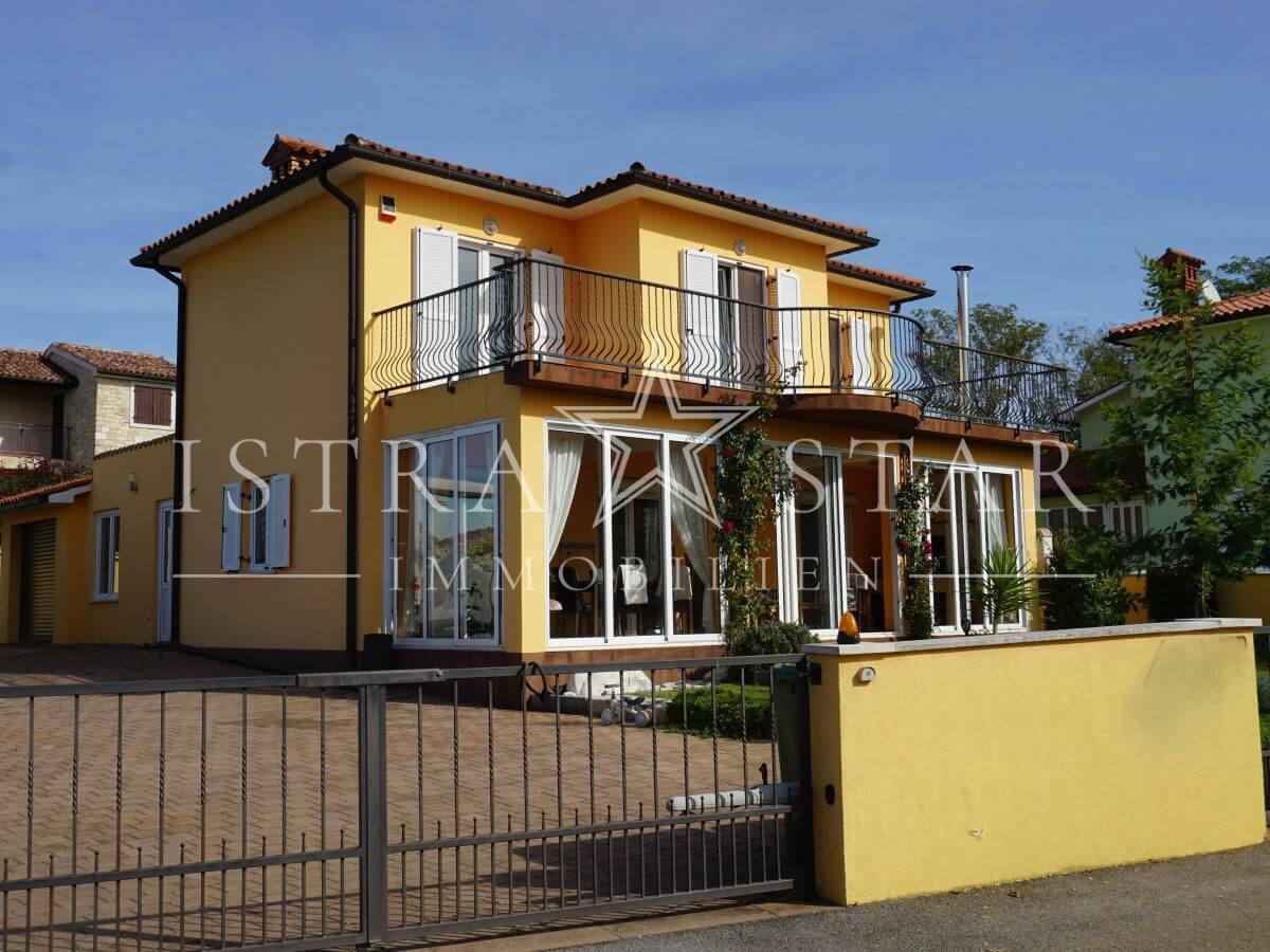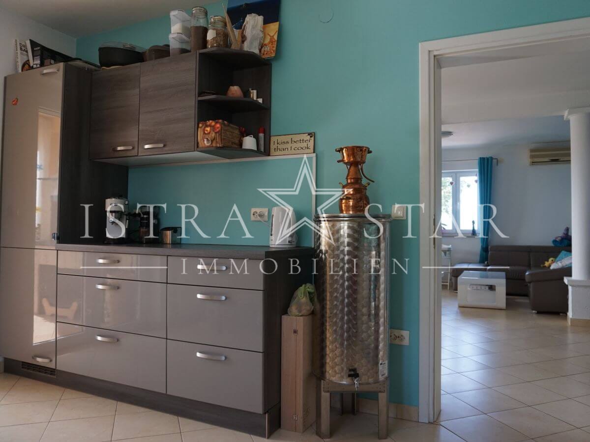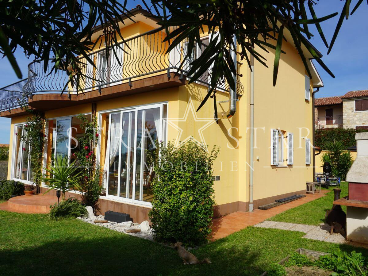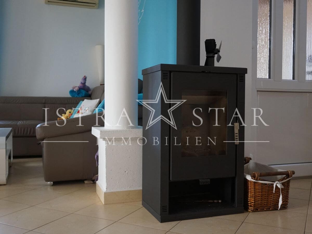 Dieses attraktive Haus verbindet Ruhe, Komfort und eine atemberaubende Aussicht in einer begehrten Weinregion nahe Porec. Die reine Wohnfläche von 111 m² ergänzt sich mit 53 m² Nutzfläche und verteilt sich über zwei Etagen (EG und OG) sowie einem zusätzlichen Kellerraum. Das Grundstück umfasst 681 m² und bietet einen gepflegten Garten mit Rasen, mediterranen Pflanzen und einem Pool hinter dem Haus. Ein Pavillon mit Sitzgelegenheit, ein Grill-Kamin sowie eine Chill- und Liegefläche laden zum Verweilen im Freien ein, während das umlaufende Mauerwerk Privatsphäre und Sicherheit gewährleistet. Eine Alarmanlage erhöht das Sicherheitsgefühl.