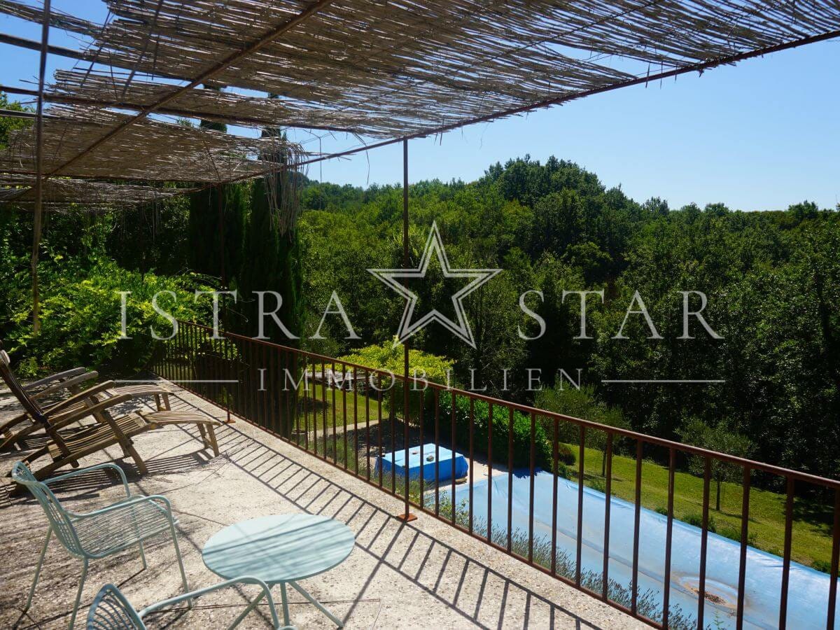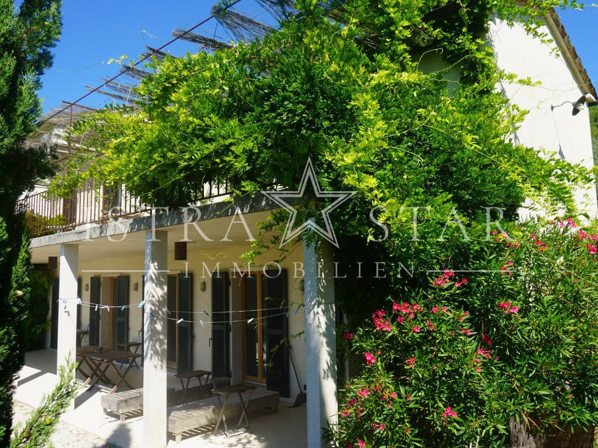 Das Anwesen beeindruckt durch seine vielfältige mediterrane Pflanzenwelt und den großzügigen Garten, welcher sich auf mehreren Ebenen erstreckt. Hier gedeihen zahlreiche mediterrane Pflanzen, Olivenbäume sowie Rasenflächen, die zum Entspannen oder für Aktivitäten im Freien einladen. Eine Treppe verbindet die Terrasse mit der Pool-Ebene – einem großen Swimmingpool mit Liegefläche für Sonnenliegen. Unterhalb dieser Ebene befindet sich ein weiterer Gartenbereich mit Bäumen und zusätzlichen Grünflächen, der Raum für Erholung und Naturerlebnis bietet.